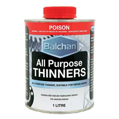 Balchan All Purpose Thinners is a premium multipurpose thinner blend, designed to thin out Balchan Industrial Enamel paints, Balchan Acrylic Lacquers, and most other oil-based air-drying paint products. It is also suitable for removing paint spots and overspray, clean up of spray guns, brushes, and other paint accessories after use. Not recommended for use on vinyl, laminates, polystyrene, plastics, fabrics, or any surface sensitive to solvents.
